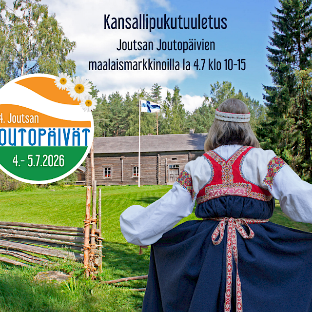 Joutsan talomuseo, Museotie 2. 19650 JoutsaJoutsan Joutopäivillä tuuletetaan kansallispukuja lauantaina 4.7. klo 10-15! Joutsan Joutopäivien maalaismarkkinoilla tuuletetaan tänä vuonna kansallispukuja. Joutsan talomuseon idyllinen miljöö onkin kuin tehty kansallispuvussa keimailua varten. Kansallispuvun tuuletuksen ohessa voit nauttia ohjelmallisten maalaismarkkinoiden tunnelmasta. Markkinoilla on myynnissä monipuolisia tuotteita sekä ruokaa, makkaraa, kahvia ja lettuja.