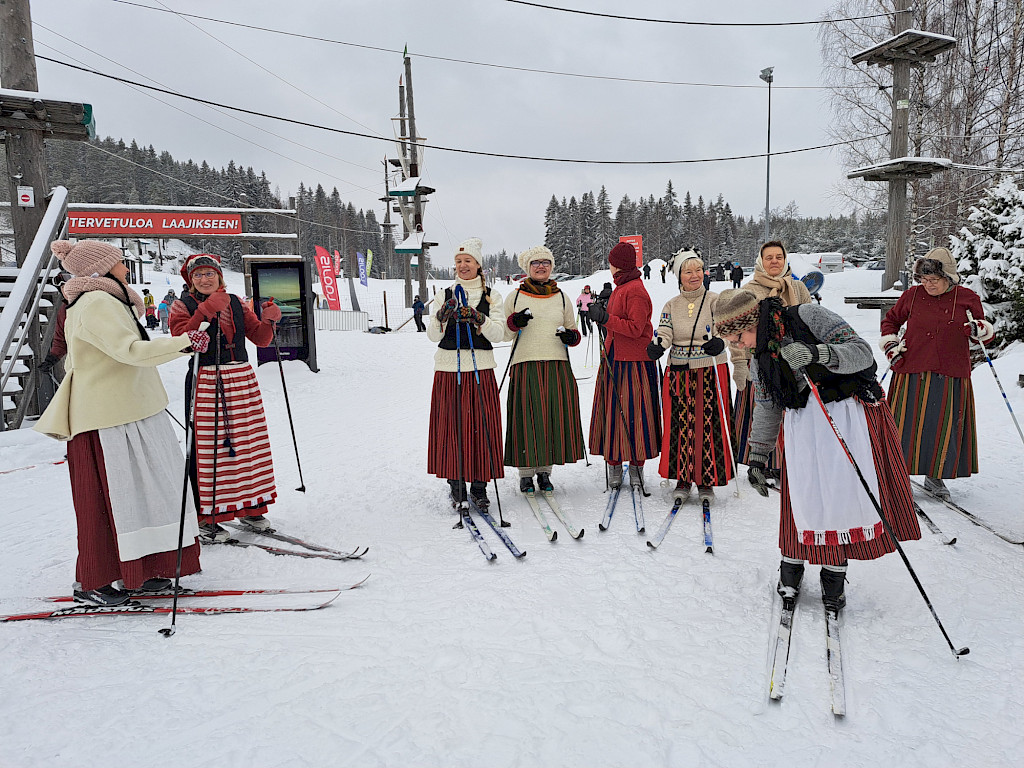 Hiihtoa ladulla tai sauvakävelyä ympäristössä. Kokoontuminen Laajiksen edessä. Omakustanteisesti kahvilaan liikunnan jälkeen.